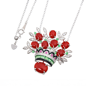 パラジウムシルバー950 血赤サンゴ ツァボライト ルビー 天然ホワイトジルコン ブローチネックレス