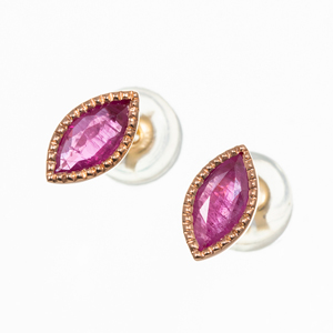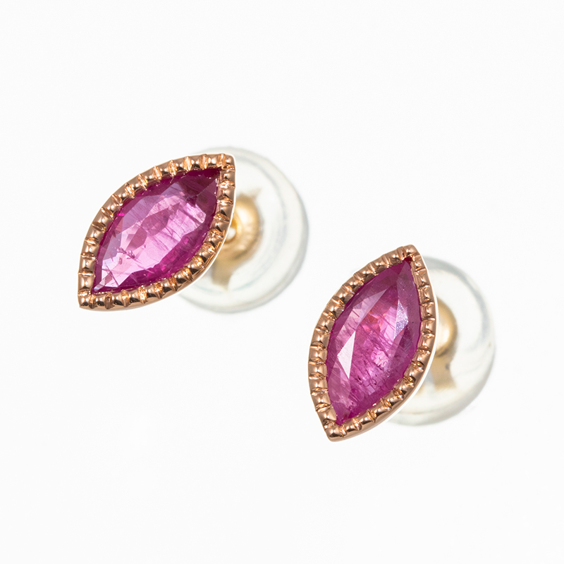 | マーキスカットのルビーを各1石使用し、周囲にミル打ちを施したシンプルで可愛らしい印象のピアスです。 |
