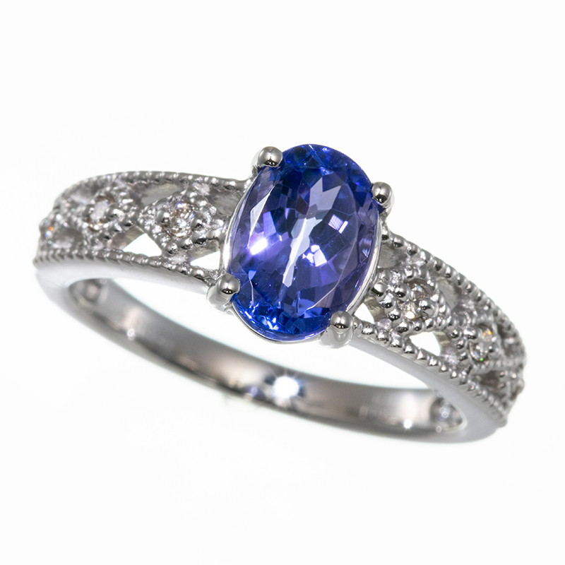| AZUSAデザイン。大粒タンザナイトをプラチナでお仕立てしたリング。腕にはミル打ちを施し、アンティーク風な雰囲気に仕上がりました。 セットアップにおすすめ ペンダントトップ(商品ID:5009692) |