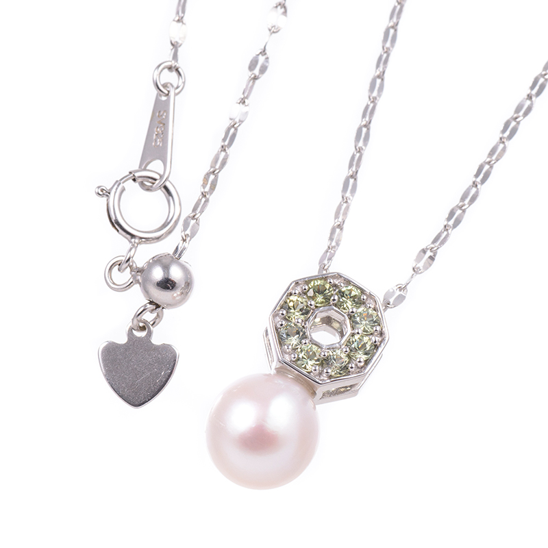 パラジウムシルバー950 アコヤ真珠 グリーンサファイア 天然ホワイトジルコン ネックレス P 約8.0mm GS 約0.25ct ZI 約0.20ct