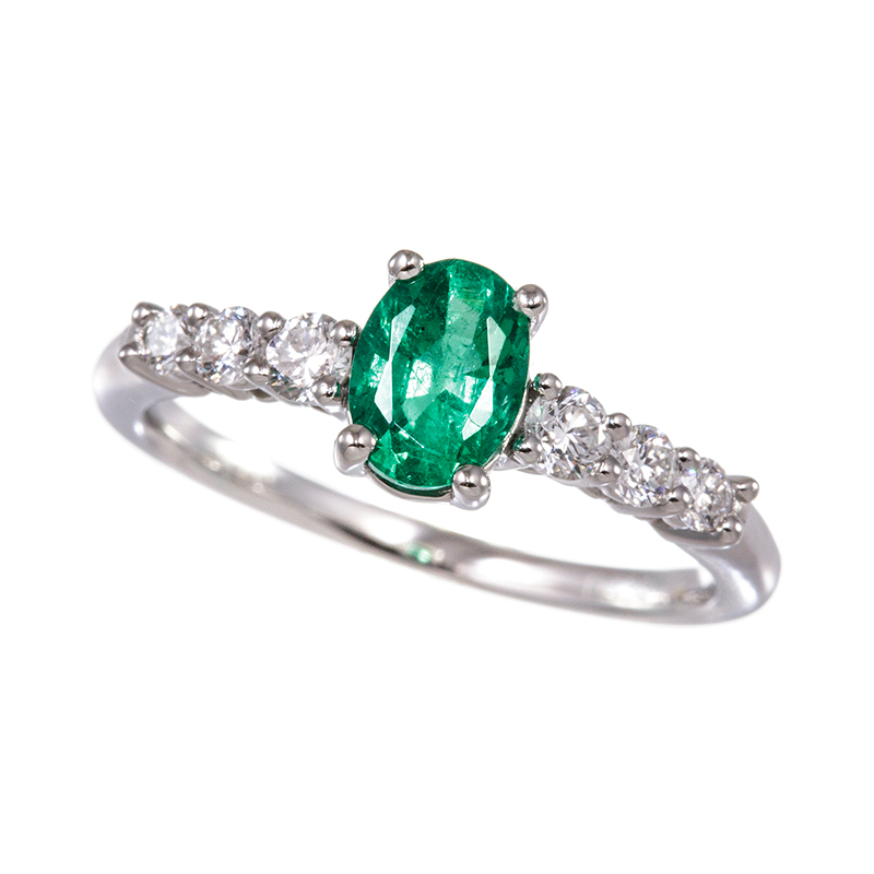 | 【2023年5月ガイド誌掲載】色乗りのよいザンビア産エメラルドを配したリング。アームにもダイヤモンドをセッティングして、上品な美しさを醸し出すジュエリーです。 |