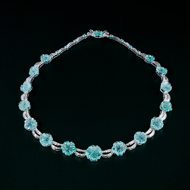 | 【2023年10月ガイド誌掲載】一点もの。パライバのカービングが華やかかつエレガントに見えるようテーパーのシャープな輝きとあわせ、後ろ姿はリボンのデザインがアクセントに。 ドイツ・イーダーオーバーシュタインでベスト3に入ると言われている宝石研磨会社のWild&Petsch(ヴィルドアンドペッチ)社によるカット。「Tradition and Perfection(伝統と完璧さ)」というモットーを掲げ、高い品質の宝石作品を送り出しています。 |