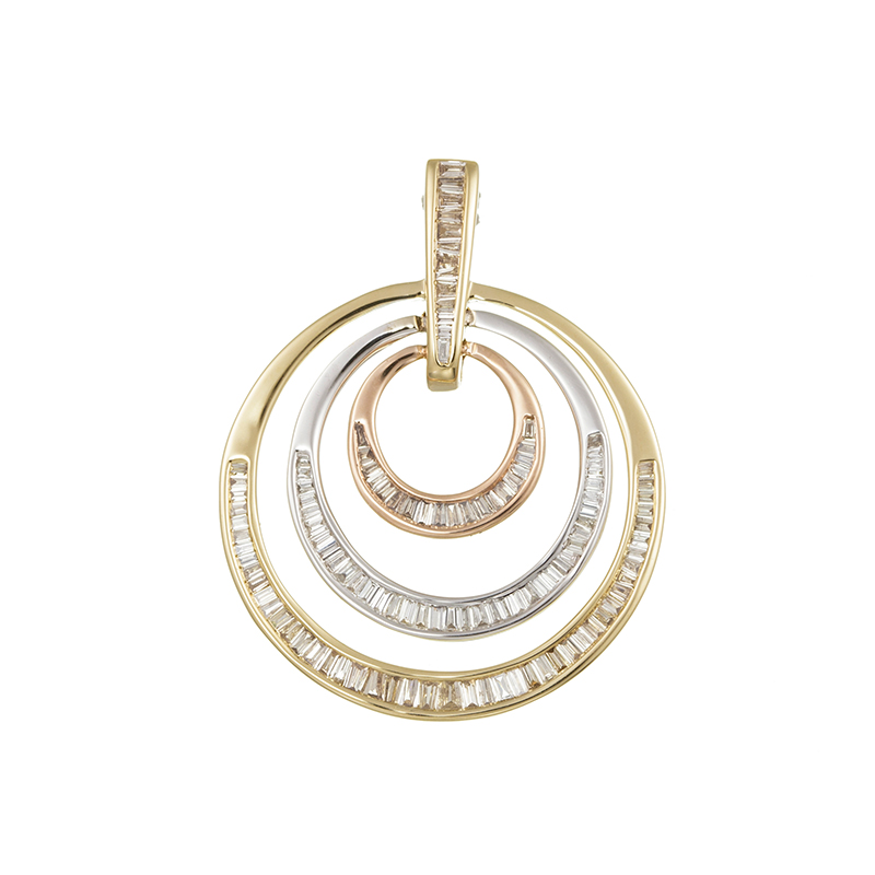 | MARIデザイン。長めのチェーンにマッチする大振りペンダントトップ。地金も華やかな3色使いなので、お好みのチェーンの色と合わせてお使いいただけます。 |
