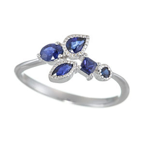 | AZUSAデザイン。オーバルカット、ペアシェイプ、マーキースカット、プリンセスカット、ラウンドカットと5種類の異なったカットを施したサファイアをバランスよく配したリング。爪留めとミル打ちを交互に施して、細部までもこだわっております。 |