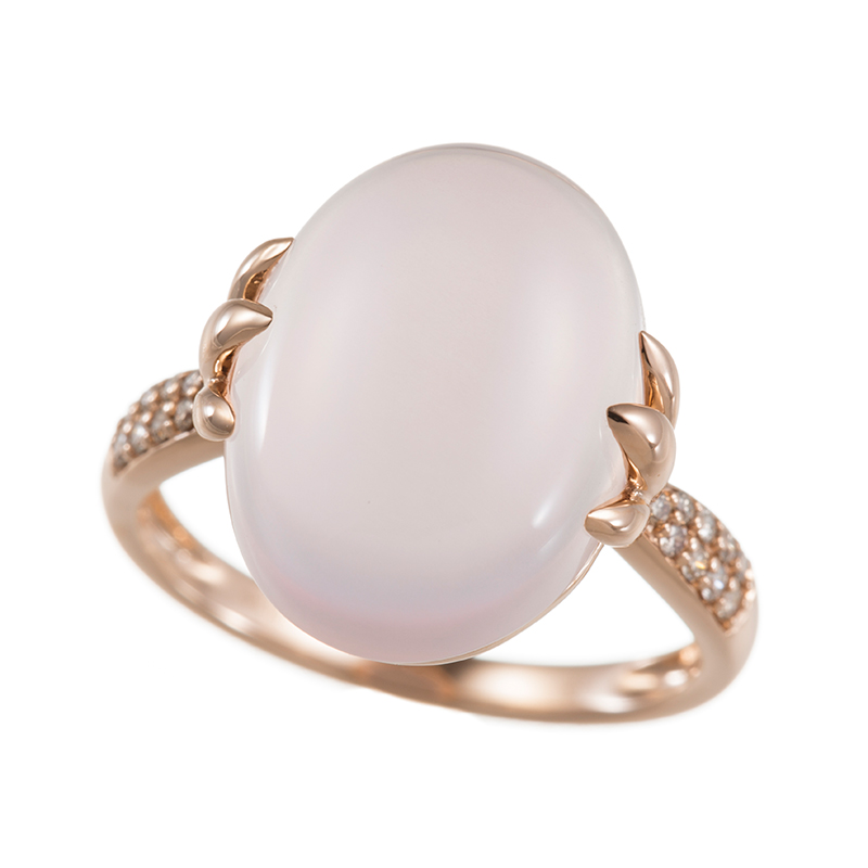 | ボタニカルなイメージのモチーフで変形留めをしたデザイン。側面から見た時に爪が無いので、つるんとしたカボションの魅力をしっかりお楽しみいただけます。ローズクォーツ、ブラウンダイヤモンド 、ピンクゴールドの組み合わせでフェミニンな女性らしい印象のジュエリーです。 セットアップにおすすめ(ペンダントトップ:5027983) |