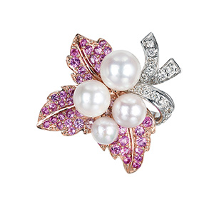| 【2020年9月ガイド誌掲載】MARIコレクション『Sea Princess』 真珠を「海に咲くお花」に見立ててデザインしたコレクション。海のプリンセスがお花を摘んでさりげなく装う姿を空想し展開してみました。ピンクサファイアの葉と真珠のお花を合わせることで、プリンセスのチャーミングなイメージを出しました。パールのサイズもバランスが良く、身に着けるとさりげない大人の可愛さを演出できます。 セットアップにおすすめ(リング:5030200、ピアス:5030202) |