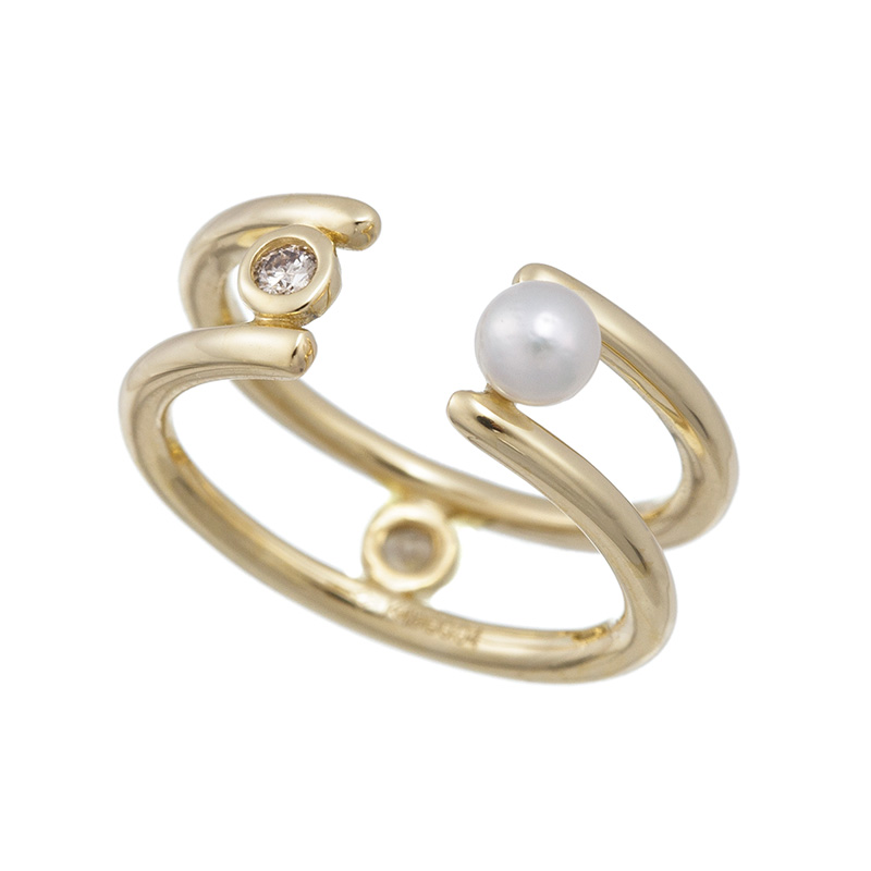 | パール側でもブラウンダイヤ側でも着けられるリバーシブル仕様のシングルイヤーカフ。あえて隠れて見えない部分にもブラウンダイヤを1ピース配置しました。耳たぶではなく対輪部分に挟んでお使いいただくイヤーカフです。 |