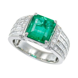 | 自然光の下でも室内の明かりの中でも、鮮やかなグリーンでその魅力を見せてくれる大粒のエメラルド。均整の取れたスクエアエメラルドカットで、腕はストライプ状にデザインし印台リングのようなユニセックスデザインにお仕立てしました。 |