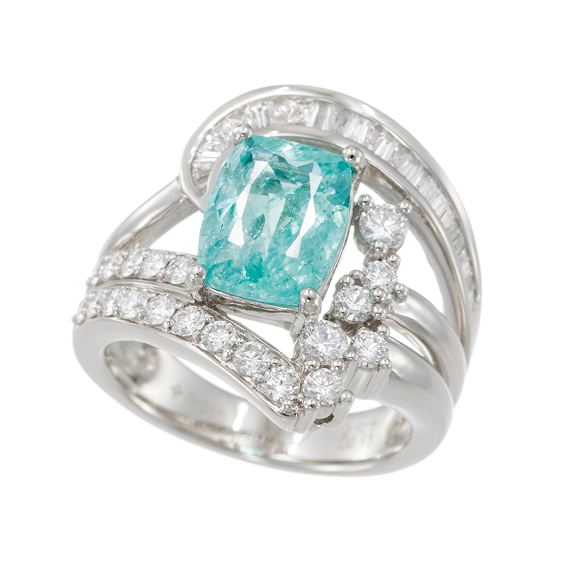 | 【2023年9月ガイド誌掲載】AZUSAデザイン パライバトルマリンがアクセントになるデザイン。地金がオリエンタルな雰囲気でモダンなお仕立てです。周囲のホワイトダイヤがキラリと光ります。 |