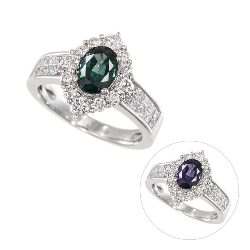 | 【2021年10月ガイド誌掲載】 1点もの。高い評価を得ているブラジル産アレキサンドライト。太陽光や白熱灯の光源によって変化する色変わりを存分にご堪能いただけます。1カラットUPの大粒に合わせて、リリー社製のダイヤモンドを贅沢に使用しました。 |