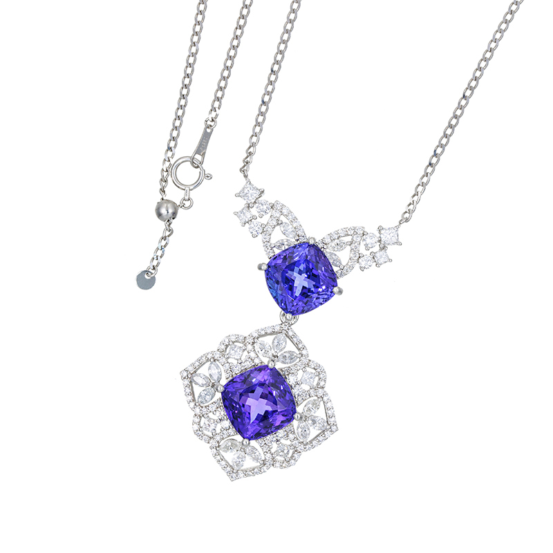 | 【2023年10月ガイド誌掲載】MARIデザイン 特優タンザナイトの贅沢な組み合わせのネックレス。バチカン部分を蝶々に見立て、下がる部分をお花に見立てた、ロマンチックで華やかなデザインです。 |