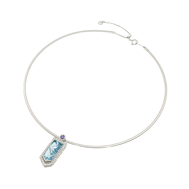 | 【2024年2月ガイド誌掲載】1点もの。ムンシュタイナーカットのアクアマリンネックレス。「ドン・ペドロ」(ムンシュタイナーカットのオブジェ。世界最大のアクアマリン)を思わせる縦長アクアマリンで、場面を存分にご堪能いただけます。剣やシールドを思わせる形状は、身を守るという意味でお守りジュエリーとして身に着けていただくのにもおすすめ。石もデザインも、特別な逸品です。 |