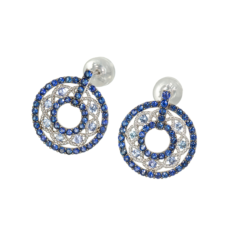 | 【2022年11月ガイド誌掲載商品】 MARIデザイン「アンティークレース」 アンティークレースの繊細な雰囲気をサファイアで表現したコレクション。可憐な模様でレースを描いていますが、全体的にボリュームを出し、存在感ある大きさに仕上げて高級感を演出しています。 セットアップにおすすめ(ペンダントトップ:5047018、リング:5047019) |