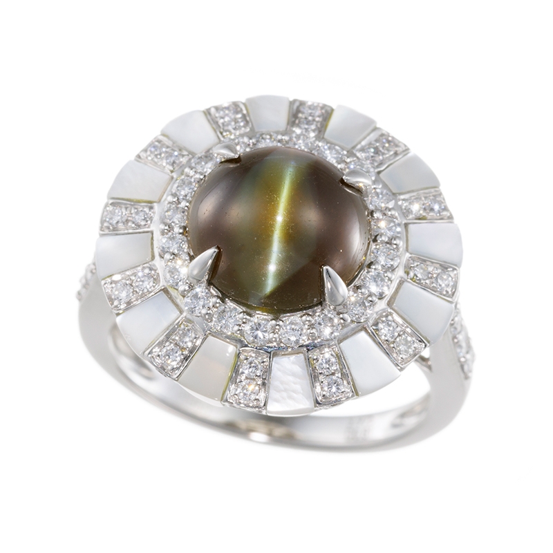 | 【2023年9月ガイド誌掲載】MARIデザイン 1点もの。中心のキャッツアイが神秘的に見えるように、神殿をイメージしてデザインしたリング。 |