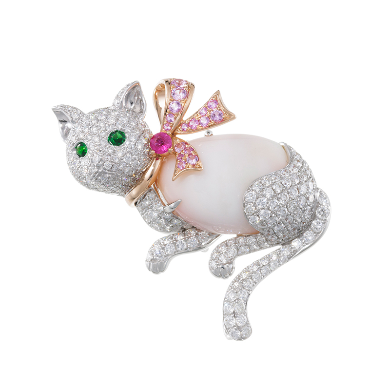 | 【2024年2月ガイド誌掲載】MARIデザイン「おすまし猫」 1点もの。コンクパールの有機的な形状よりインスピレーションを得ました。貴婦人に飼われているおすましした猫をイメージしてデザインした、チャーミングなジュエリーです。 |