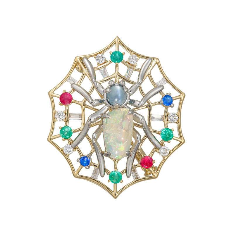 | 【2023年6月ガイド誌掲載】AZUSAデザイン 1点もの。蜘蛛がモチーフのペンダントブローチ。メキシコオパールとアレキサンドライトキャッツアイで神秘的な蜘蛛の体を表現しました。蜘蛛の巣をYGにすることで、カラフルなお石を引き立てました。 |