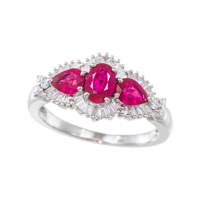 | 【2023年6月ガイド誌掲載】オーバルカットとペアシェイプカットのパッション・レッドルビーをリングにお仕立てしました。脇石にはダイヤモンドを配した、華やかな印象のジュエリーです。 |