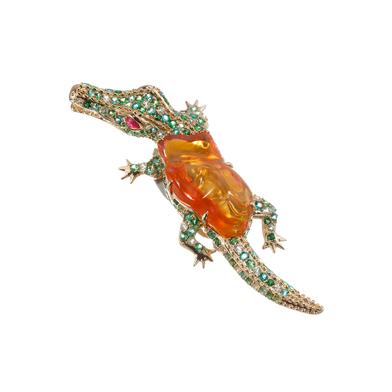 | 【2023年6月ガイド誌掲載】AZUSAデザイン 1点もの。メキシコオパールの形状を生かしたワニのブローチ。ワニの体にはグリーン系の色石をパヴェセッティングでお仕立てしました。力や強さをシンボルとするワニは古代エジプトでは生命の源であるナイル川を象徴する聖なる動物として崇められ、神聖視されていました。 |