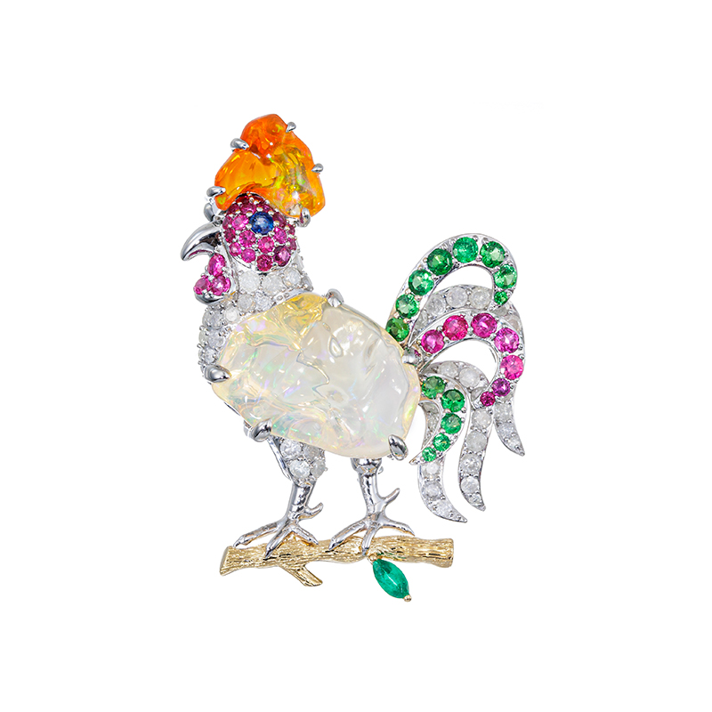 | 【2023年6月ガイド誌掲載】AZUSAデザイン メキシコオパールの形状を生かした雄鶏モチーフのブローチです。フランスのシンボルである「雄鶏」。雄鶏の鳴き声は悪魔を寄せ付けないと言われ、明け方に鳴くという習性から太陽を連れてくる力があるとされていました。目にはブルーサファイア、葉はコロンビア産エメラルドをセッティングしております。 |