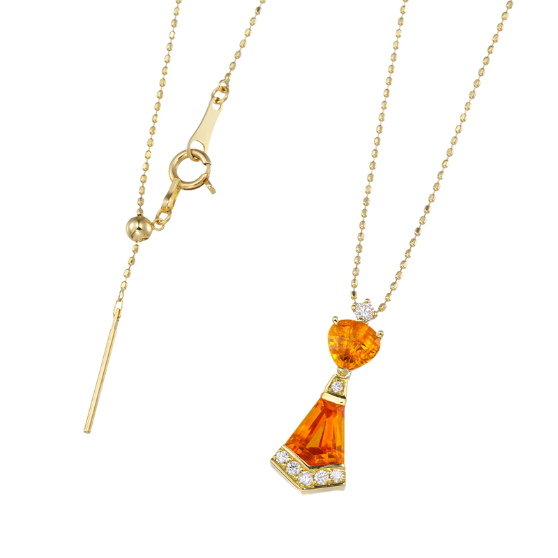 | 【2023年4月ガイド誌掲載】マンダリンガーネットの特徴は、他の宝石では見つけることのできない濃いオレンジ色。2種類の異なったカットのお石を組み合わせて、Iラインのスタイリッシュなデザインにお仕立てしたネックレスです。 |