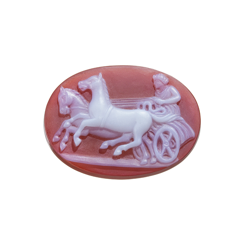 | 【2023年6月ガイド誌掲載】「戦車と騎士」。ハンス・ディーター・ロート作手彫りカメオ。約100年前にカメオ用にカットされた石に近年彫刻を施したカメオシリーズ。 |