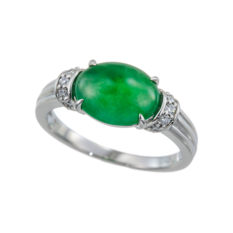 | 【2024年2月ガイド誌掲載】1点もの。 うるっとテリのあるヒスイを横向きにセッティングすることで、スタイリッシュなヒスイジュエリーにお仕立ていたしました。サイドにリボンのように帯状にダイヤモンドを配し、中石の色味を引き立ててくれます。ユニセックスにお召しいただけます。 |