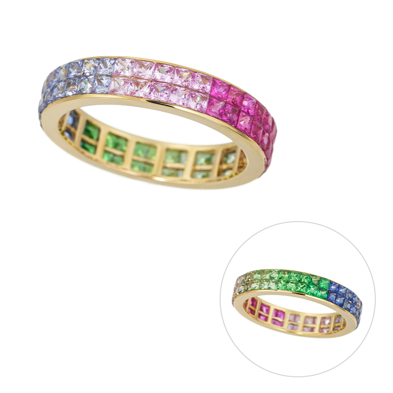 | 【2024年2月ガイド誌掲載】AZUSAデザイン 着ける角度によって印象が変わるデザイン。虹のように彩り豊かな心や人生をイメージして様々なカラーストーンを使ったフルエタニティリング。雨上がりの空にかかる美しい虹は幸運の架け橋・希望・平和の象徴として古くから多くの人たちに親しまれ、多くの色を含むことからすべての可能性も表すと言われています。 同デザイン(#10-145067048、K18YG #15-18 5067050、K18YG #15-18 5067051) |
