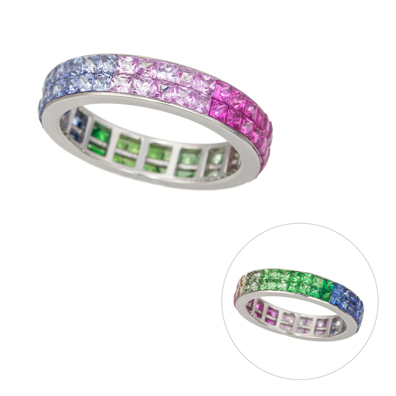 | 【2024年2月ガイド誌掲載】AZUSAデザイン 着ける角度によって印象が変わる「Rainbow」リング。虹のように彩り豊かな心や人生をイメージして、様々な色石を使ったカラフルなフルエタニティリングです。雨上がりの空にかかる美しい虹は、幸運の架け橋・希望・平和の象徴として古くから多くの人たちに親しまれ、すべての可能性も表すと言われています。 同デザイン(M:5067051、YG S:5067048、M:5067049、1列PT S:5067046、M:5067047) |