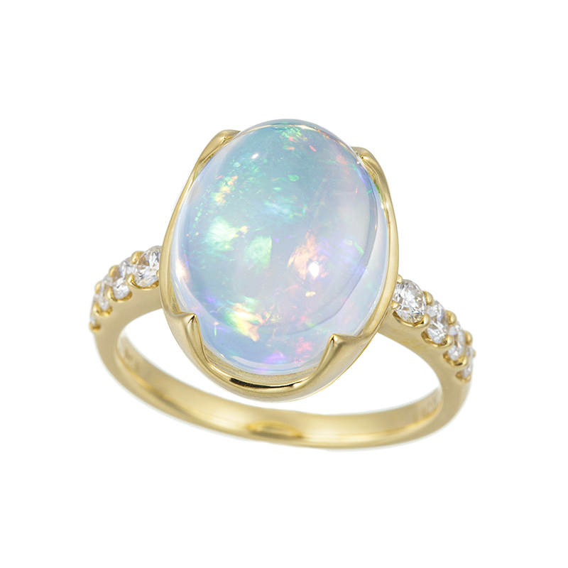 | 【2023年12月ガイド誌掲載】AZUSAデザイン 1点もの。大粒のウォーターオパールを地金で包み込むようなセッティングにこだわったリング。腕のダイヤがウォーターオパールをより一層引き立て綺麗に見せてくれます。 |