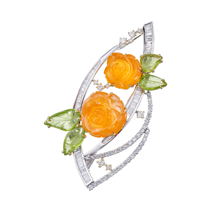 | 【2023年9月ガイド誌掲載】1点物。クラウス・バステン氏によりカービングが施された、マンダリンガーネットとペリドットが織りなすボタニカルな美しさ。コレクター垂涎ものの逸品です。 |