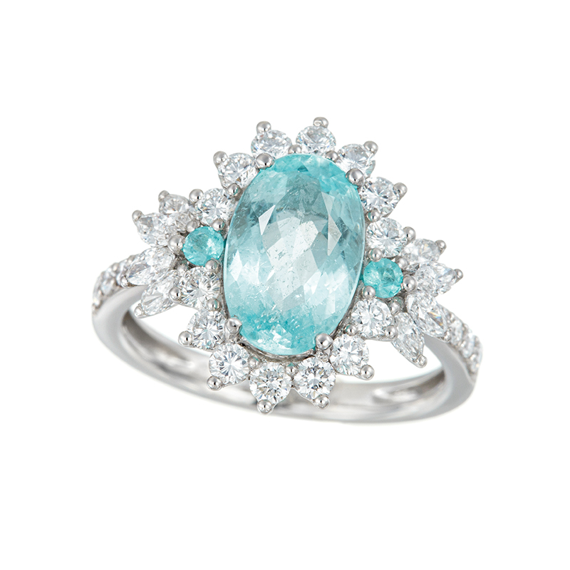 | 【2024年4月ガイド誌掲載】1点もの。中石はモザンビーク産パライバトルマリン。脇を飾るのはブラジル産パライバトルマリン。王道の取り巻きスタイルの左右にマーキースカットダイヤモンドの花を添えることで、華やか且つフェミニンはリングにお仕立ていたしました。 |