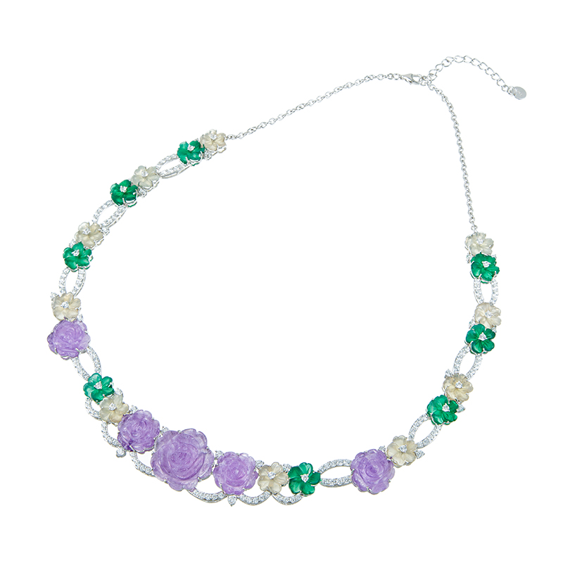 | 【2025年2月ガイド誌掲載】AZUSAデザイン シルバーとフラワーカービングの石を使った華やかなフルネックレス。宝石の花が咲く森をイメージし、深みのあるシックな色合いでお仕立てしました。脇石には天然ホワイトジルコンを留め、さらに輝きを引き立てています。 |
