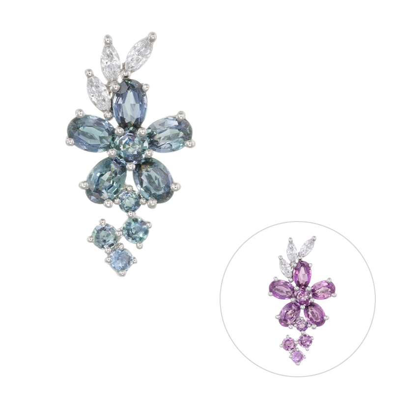| 【2024年6月ガイド誌掲載】ブラジル産のアレキサンドライトとダイヤモンドが美しく輝く「エモーションフラワー」ペンダントトップ。アレキサンドライトはすべてブラジル産で、その石の美しさから感動や喜びを感じていただけるジュエリーとして、「エモーションフラワー」という名前を冠しました。感性豊かなフラワーデザインが、エレガントな装いを演出します。 |