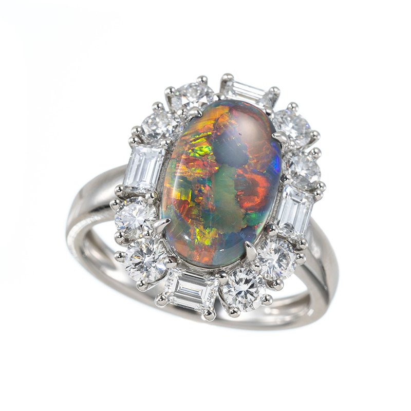 | 【2024年5月ガイド誌掲載】希少なブラックオパールが入荷。1.983ctというサイズ感でコレクションにも十分ですが、さらに場面の広さが魅力的です。トラディショナルな取り巻きデザインに、リリー社のテーパーカットダイヤモンドをアクセントに使い、豪華かつノーブルなリングにお仕立ていたしました。 |