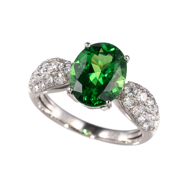 | 【2024年4月ガイド誌掲載】1点もの。 貴重な約3ctのツァボライトをリングにお仕立ていたしました。腕にはリリー社の輝きの良いダイヤモンドを贅沢に配した、華やかなパヴェアーム。メレダイヤモンドの中でも1石1石、大粒のものを使用しています。お着物と合わせるのもおすすめです。 |