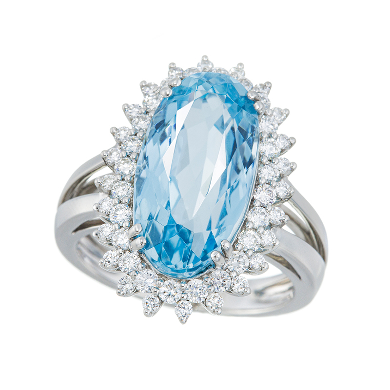| 【2024年10月ガイド誌掲載】1点もの。近年では希少な大粒のアクアマリン。色乗りもよく、まさに海の水面のようなきらめきを感じていただけるルース石に、ダイヤモンドを2重に取り巻いた華やかな逸品。縦長のシェイプを生かしたデザインで、スタイリッシュにお召しいただけます。 |