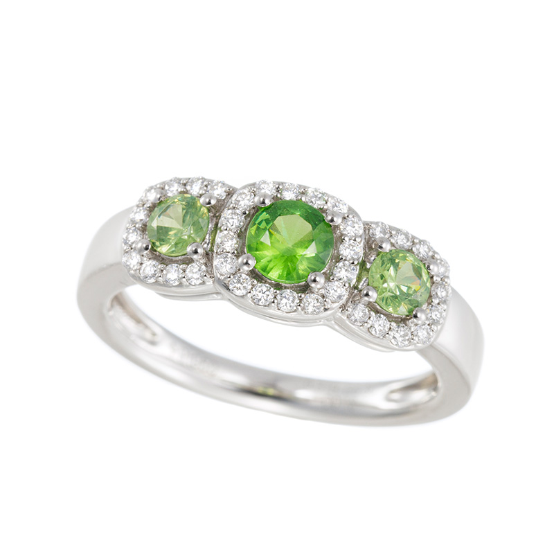 | 【2025年6月ガイド誌掲載】ラウンドカットを施したウラル産デマントイドガーネットのスリーストーンリング。華やかにダイヤモンドで取り巻き、アンテーククッションカットのような存在感のあるフォルムを表現しました。中石のグリーンの濃淡を指元でお楽しみいただけます。 |