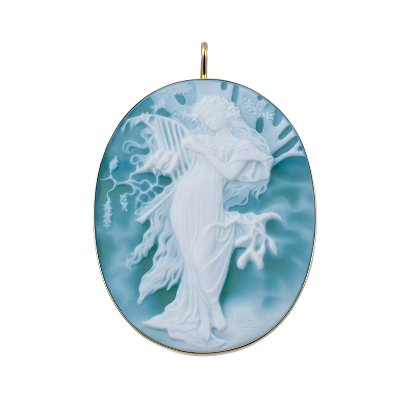| 【2025年3月ガイド誌掲載】ミシャエル・ポイスター氏によるメノウカメオ彫刻作品。アルフォンス・ミュシャ連作の四季シリーズ、『春』。 |