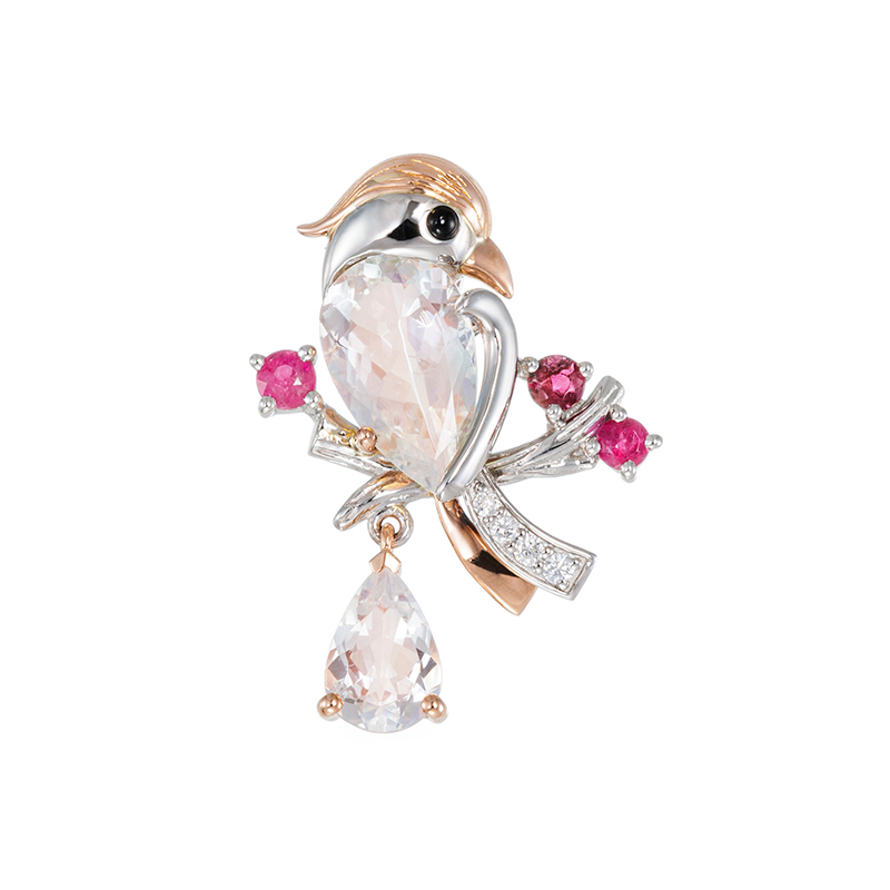 | 【2026年3月ガイド誌掲載】MARIデザイン「ファンタジーバード」 ファンタジーの世界から飛び出してきた鳥をイメージしたペンダントトップ。ボディには幻想的な風合いを生かしたアンデシン/ラブラドライト、尾や頭にはダイヤモンドを配し、K18ピンクゴールドで嘴や毛並みを表現しました。アクセントにはお花に見立てたレッドベリルをあしらった贅沢なお仕立てです。 同シリーズ(ペンダントトップ:5087926、ペンダントブローチ:5087929、ピアス:5087927) |