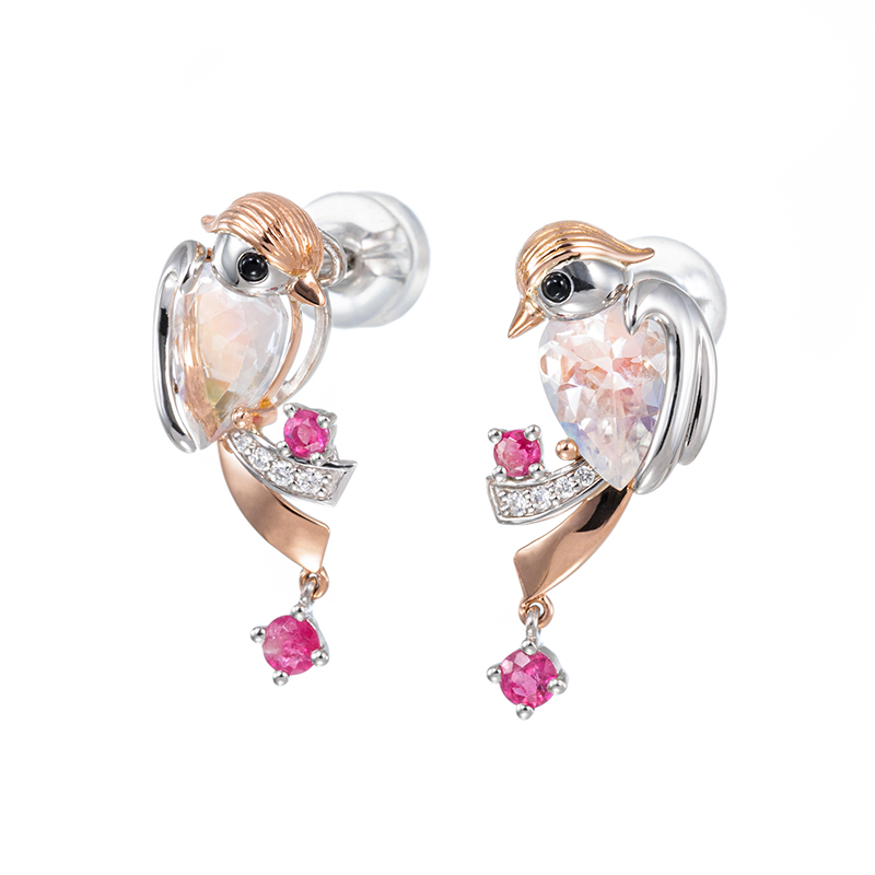 | 【2026年3月ガイド誌掲載】MARIデザイン「ファンタジーバード」 ファンタジーの世界から飛び出してきた鳥をイメージしたピアス。ボディには幻想的な風合いを生かしたアンデシン/ラブラドライト、尾や頭にはダイヤモンドを配し、K18ピンクゴールドで嘴や毛並みを表現しました。アクセントにはお花に見立てたレッドベリルをあしらった贅沢なお仕立てです。 同シリーズ(ペンダントトップ:5087925、5087926、ペンダントブローチ:5087929) |