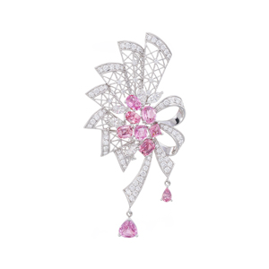 PT950 マダガスカル産非加熱パパラチアサファイア & ピンクサファイア ダイヤ Fan ブローチ PPS 3.43ct PS 0.53ct D 2.07ct