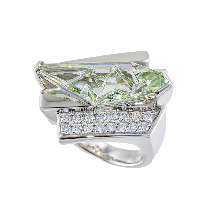 | 【2026年3月ガイド誌掲載】MARIデザイン 1点もの。トム・ムンシュタイナー氏による「マンティスカット」が施されたベリルを主役にしたリング。身に着けた際に自然に調和するよう細部までこだわったデザインです。特別なカットが放つ複雑な輝きを、お手元で存分にご堪能いただけます。 |