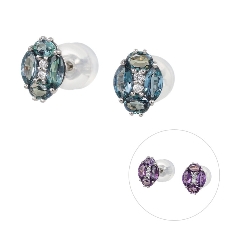 | 【2025年12月ガイド誌掲載】幻想的で神秘的な雰囲気をまとったアレキサンドライトのピアス。装飾的な格子窓をイメージし、格子の隙間にダイヤモンドをセッティングしました。カラーチェンジ効果で1つのジュエリーで2つの表情を楽しめます。 |
