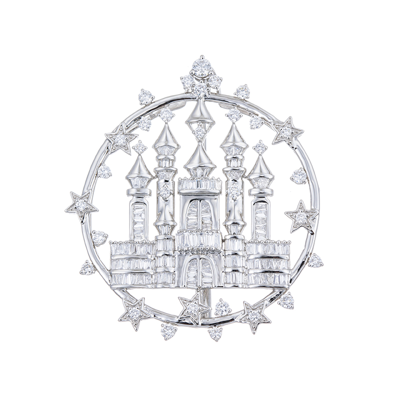 | 【2026年2月ガイド誌掲載】MARIデザイン「Castle」 天空に浮かぶ城をイメージしたペンダントブローチ。合計約1.60ctのダイヤモンドが幻想的にきらめき、優雅で華やかな表情を演出します。大ぶりながらサークルフォルムで上品にまとまり、長めのチェーンとのコーディネートも美しく決まるジュエリーです。 同シリーズ(ペンダントトップ:5091154) |