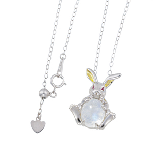 | 【2025年12月ガイド誌掲載】AZUSAデザイン 立体感にこだわった月うさぎモチーフのネックレス。オーバルカボションカットを施したレインボームーンストーンを抱え、目にはルビー、耳の内側は金メッキで彩ったデザインです。青白く幻想的に輝くレインボームーンストーンのシラー効果が角度によって表情を変え、月のような美しさをご堪能いただけます。 |