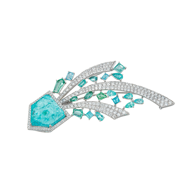| 【2025年2月ガイド誌掲載】MARIデザイン「シューティングジェム」 1点もの。ブラジル産パライバトルマリンを流れ星に見立てたロマンティックで幻想的なデザイン。勢いよく流れるプラチナの曲線が美しいフォルムを形作り、地金に留められたダイヤモンドが中石の輝きを引き立てます。横向きにすることでオメガチェーンに合わせてお召しいただけます。 |