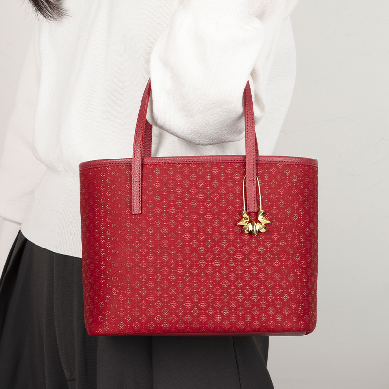 お客様からのご要望が多かった大きめサイズのバッグを、スターフラワー柄にして制作しました。印伝は柔らかく軽い鹿革と、時とともに色合いが変わる漆との調和により、使い込むほど独特の風合いが出てくるのが特徴です。また重厚感があるデザインながらも、鹿革の軽さによって想像以上に軽さを感じられます。