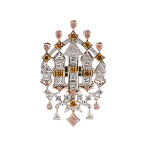 PT950/K18PG/YG ファンシーパープリッシュピンク & ファンシーディープイエローダイヤ Castle ペンダントブローチ PD 0.275ct(SI1) PD 0.076ct(SI2) PD 0.136ct(VS2) PD 0.039ct(SI2) PD 0.15ct YD 0.076ct(SI2) YD 0.60ct D 2.55ct