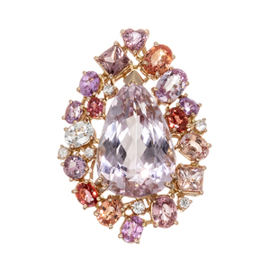 JSM52440: K18PG クンツァイト ピンクサファイア オレンジサファイア ホワイトサファイア ダイヤモンド ペンダントトップ KU 12.96ct SA 4.72ct D 0.15ct