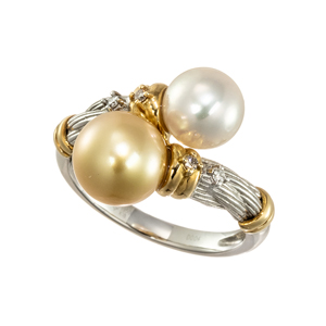 JSM52966: 【13号】PT950/K18YG ナチュラルゴールデン白蝶真珠 & アコヤ真珠 ダイヤ & ブラウンダイヤ リング P 約8.0mm P 約7.5mm D 0.02ct BRD 0.02ct